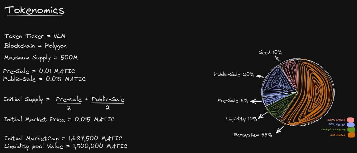 The vested VLM tokens are distributed in payment blocks of 1% each until the maximum supply is reached, the payment schedule depends on how many active players we have in the game. The balances of less than 1000 VLM will be unlocked on the first payment.
